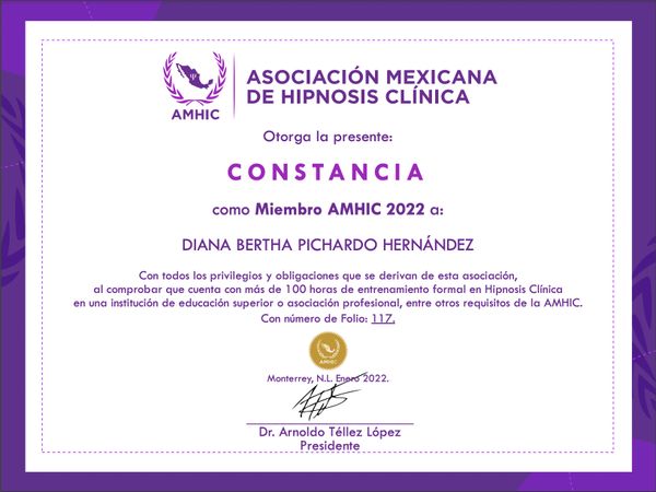 También formo parte de la Asociación Mexicana de Hipnosis Clínica AMHIC para la conexión que debe de existir entre la mente y el corazón, ya que considero que esa es la clave para TU BIENESTAR. Estoy aquí para apoyarte a que eso suceda y logres ser tu mejor versión.
